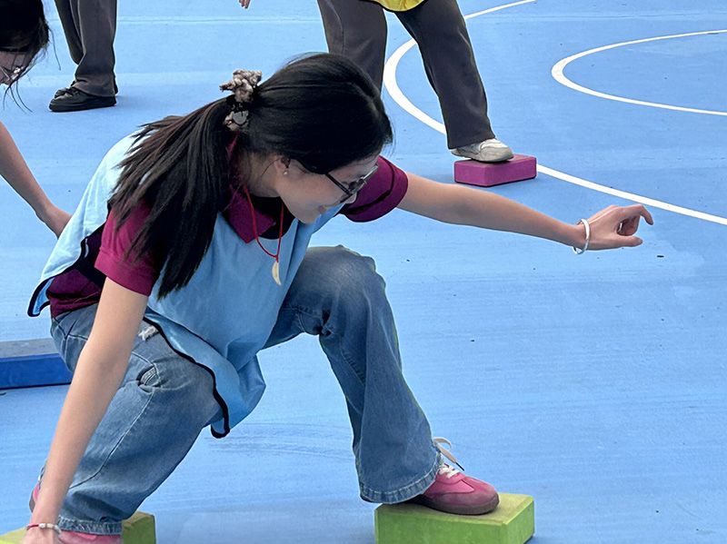 在“跳出活力·绳采飞扬”竞技中,两条12米长绳在空中划出整齐弧线,各小组队员默契配合、依次入网,双脚同步跳跃间展现着昂扬向上的精神风貌。“摸石头过河”环节里,参赛队员踩着泡沫砖稳步接力,在平衡与速度的较量中,大家群策群力规划路线,高效完成接力任务,展现了严谨细致、协同作战的优良作风。