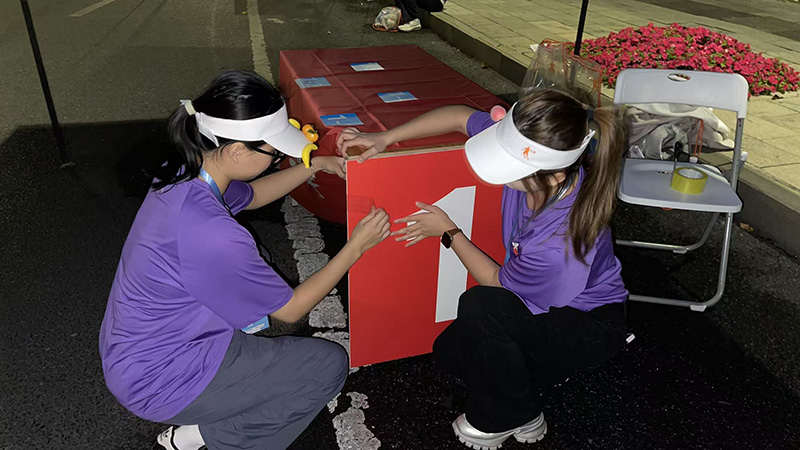 凌晨4时10分,天未破晓,文学院志愿者已全员集结完毕,带着饱满热情奔赴赛事现场。抵达20km补给点后,志愿者们迅速投入前期筹备:大家分工明确、协作默契,志愿者们仔细摆放饮用水、功能饮料,确保每一瓶补给都触手可得,分工协作搭建起高效运转的服务站点。经过近一个小时的紧张忙碌,所有补给物资、服务设施于7时全部准备就绪,静候参赛选手到来。