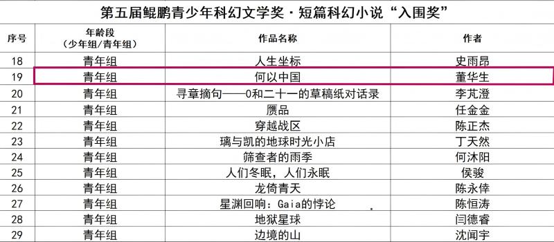 获得短篇科幻小说青年组入围奖的董华生同学