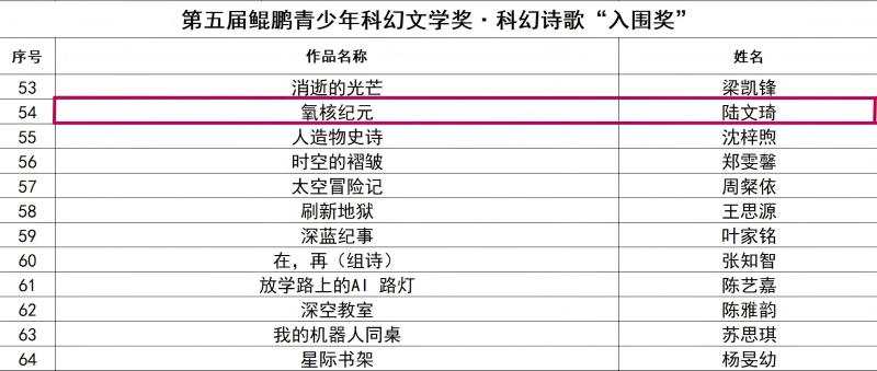 获得科幻诗歌组入围奖的陆文琦同学