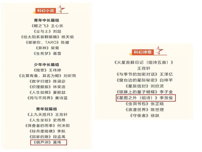 获得科幻小说青年短篇组的莫伟同学和科幻诗歌组大奖的李孜俊同学