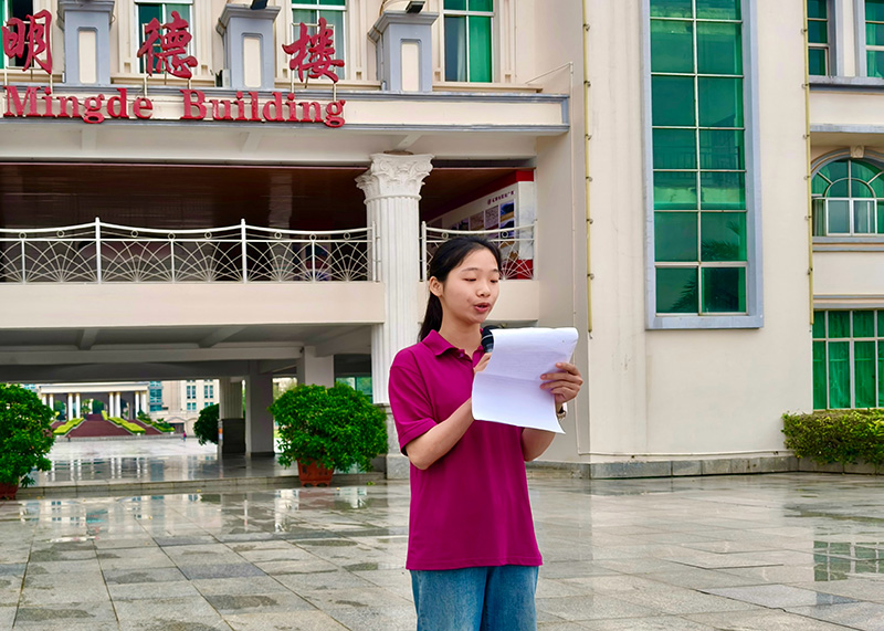 升旗仪式后,学院开展爱国教育主题宣讲,引导全体师生铭记历史、勇担使命。来自汉语2408班的学生代表黄敏,以《以青春之火 点亮强国征程》为题发言,并向全院学子发出倡议:要在深学笃行中筑牢信仰之基,坚定理想信念;要在铭记历史中厚植爱国之情,传承先辈精神;要在砥砺奋斗中践行报国之志;要在集体前行中汇聚青春之力,让青春在强国建设中绽放光彩。